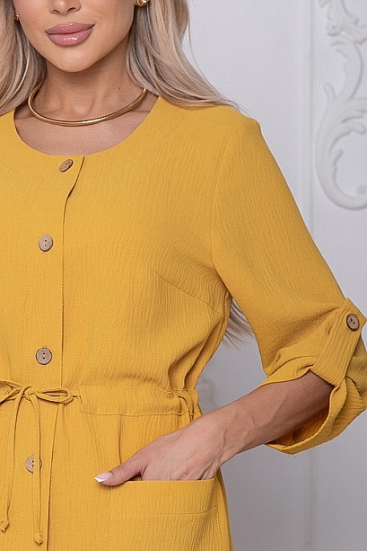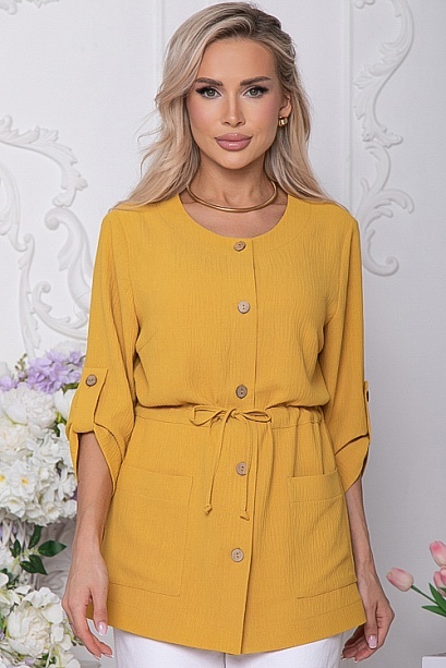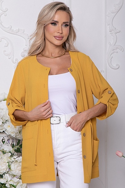 Жакет свободного силуэта из текстильного полотна.Центральная застежка на петли и пуговицы,по талии кулиска.По переду накладные функциональные карманы.Рукав втачной с патой.