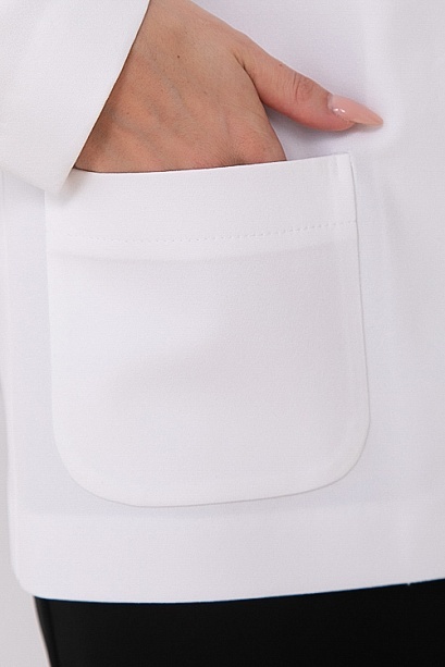 Жакет из костюмной ткани прямого силуэта в стиле шанель.По переду функциональные накладные карманы и центральная застежка на нарядные жемчужные пуговицы.