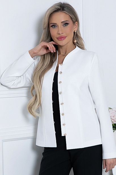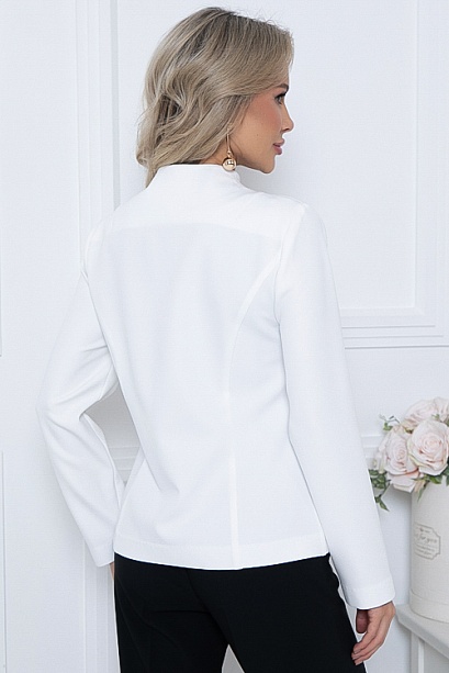 Жакет из костюмной ткани полуприлегающего силуэта.Воротник цельнокроенная стойка,застежка встык на навесные петли.