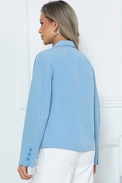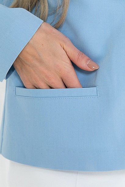 Жакет из вискозной костюмной ткани прямого силуэта с центральной застежкой на 2 пуговицы.Воротник отложной с лацканами.Рукава втачные, со шлицей по низу,украшенные пуговицами.По переду два функциональных прорезных кармана с листочками.