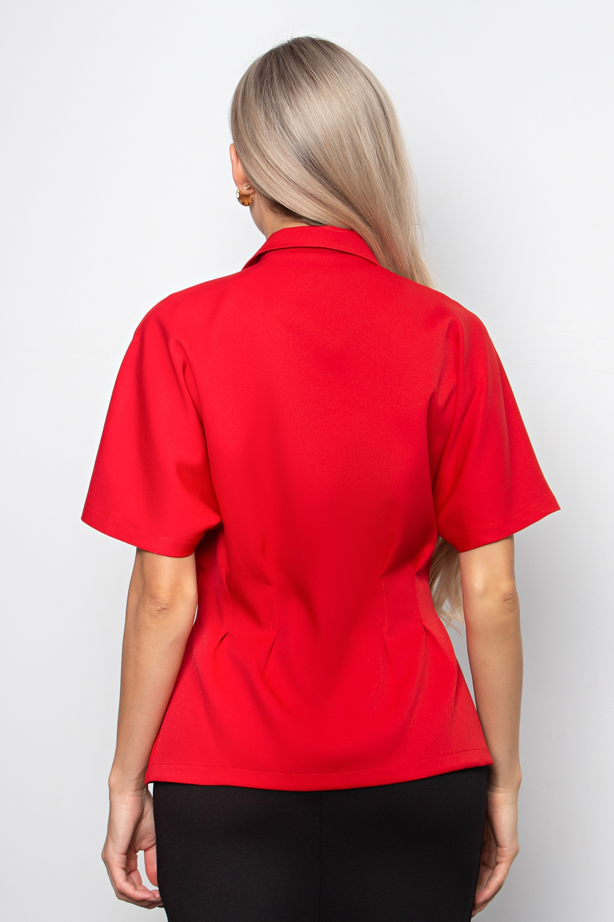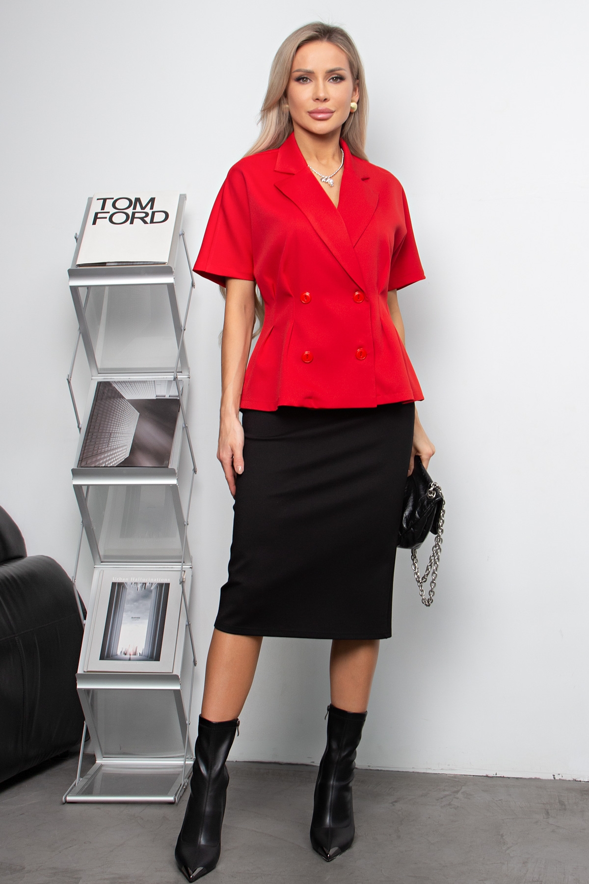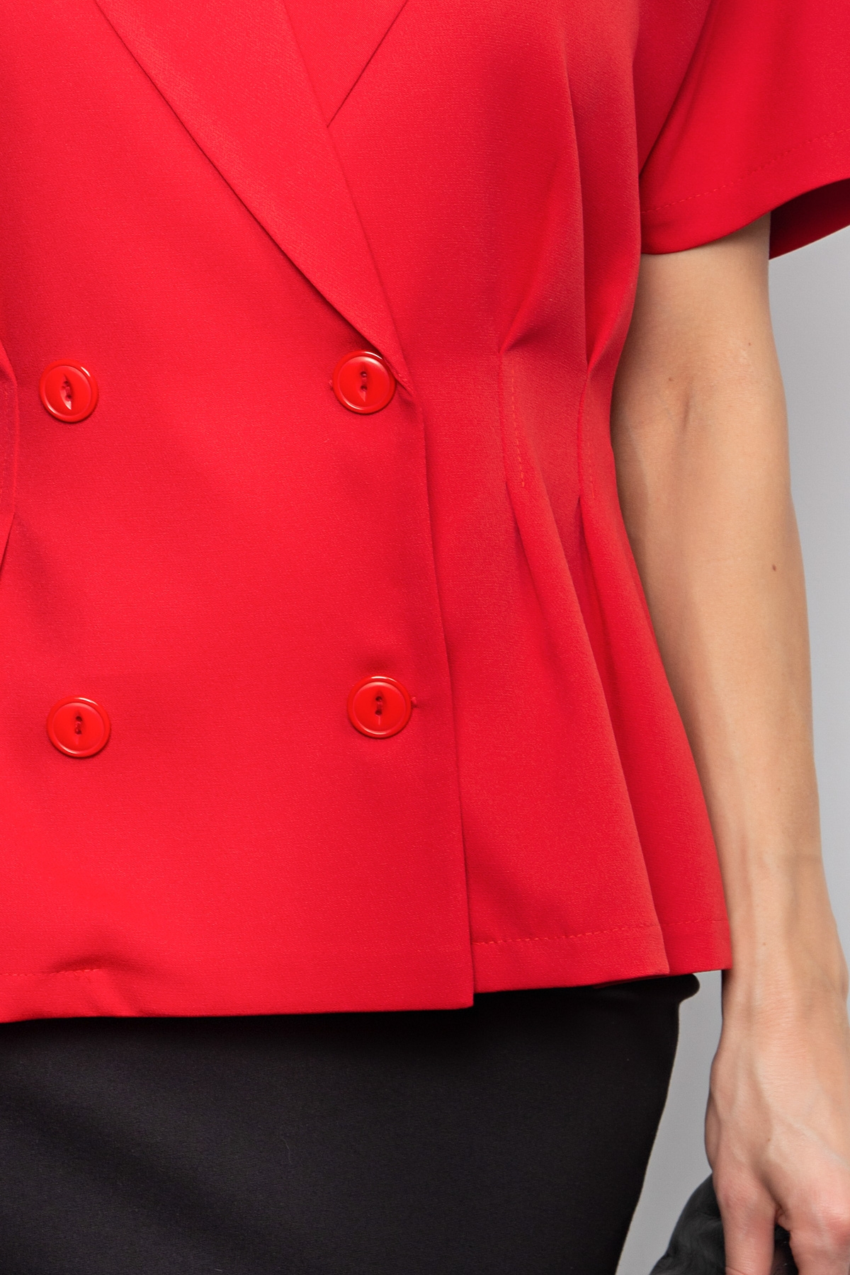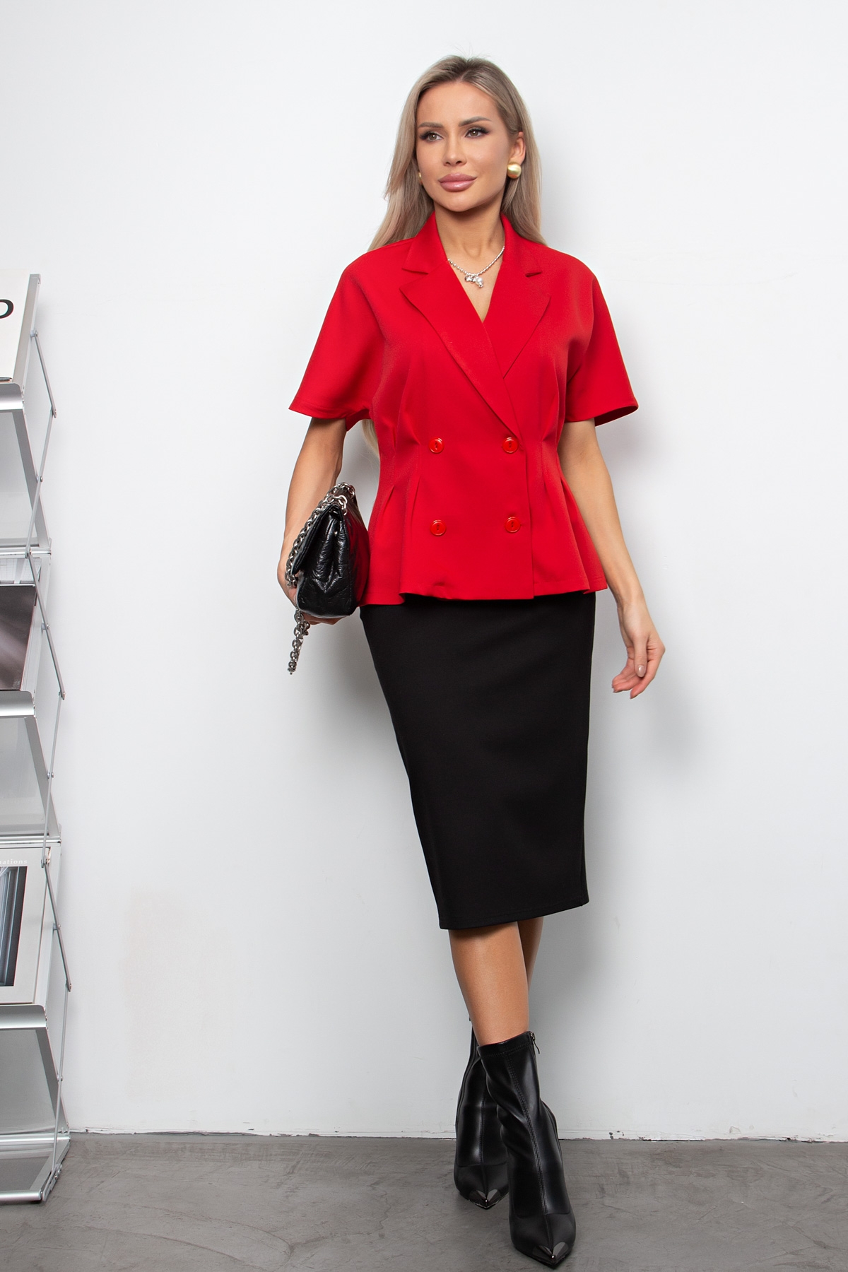Комфортный летний жакет приталенного силуэта выполнен из легкой костюмной ткани. Цельнокроенный короткий рукав. Английский отложной воротник. Двубортная застежка на петли и пуговицы. По линии талии застрочены складки. Низ ровный, без разрезов.