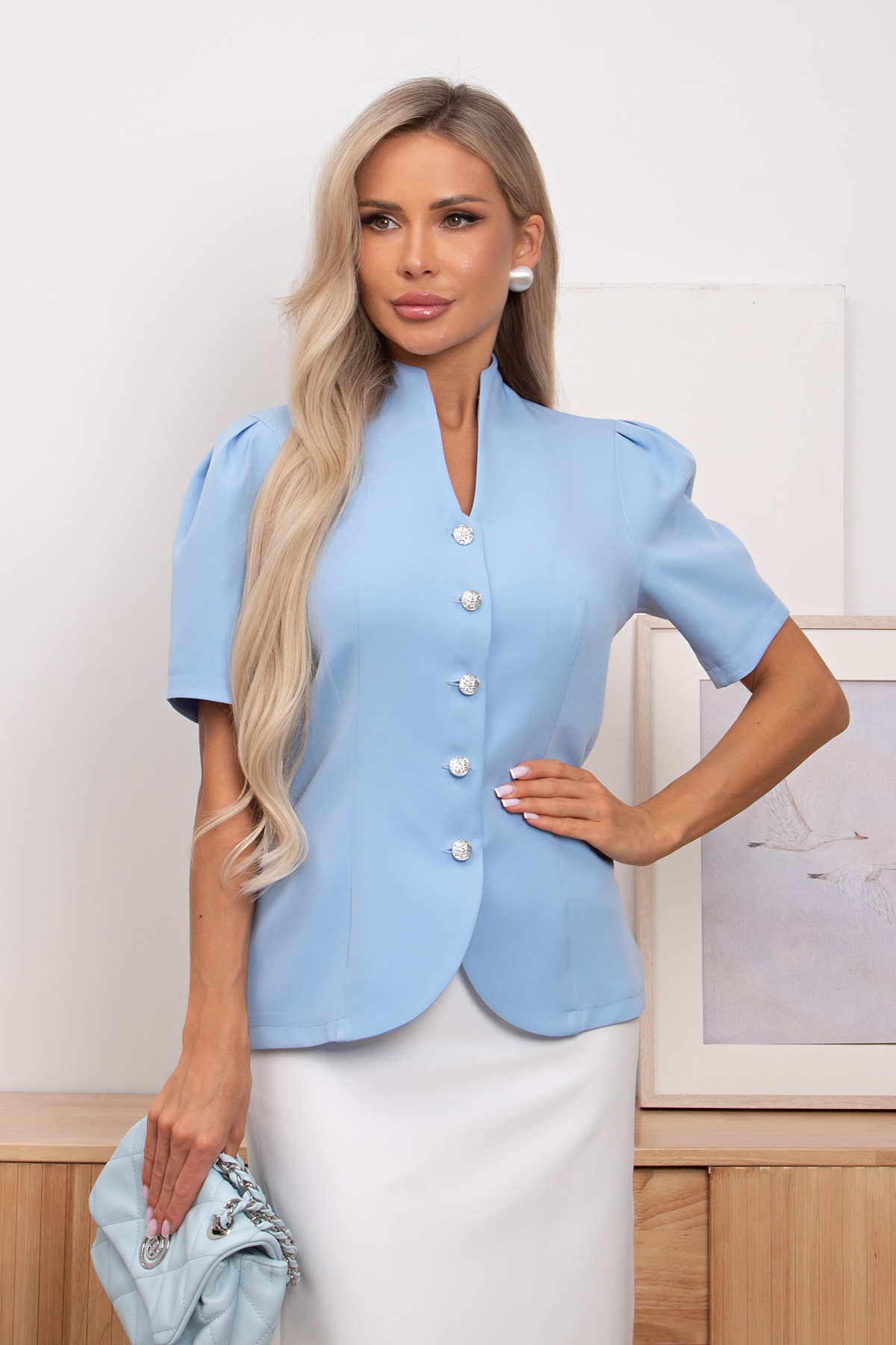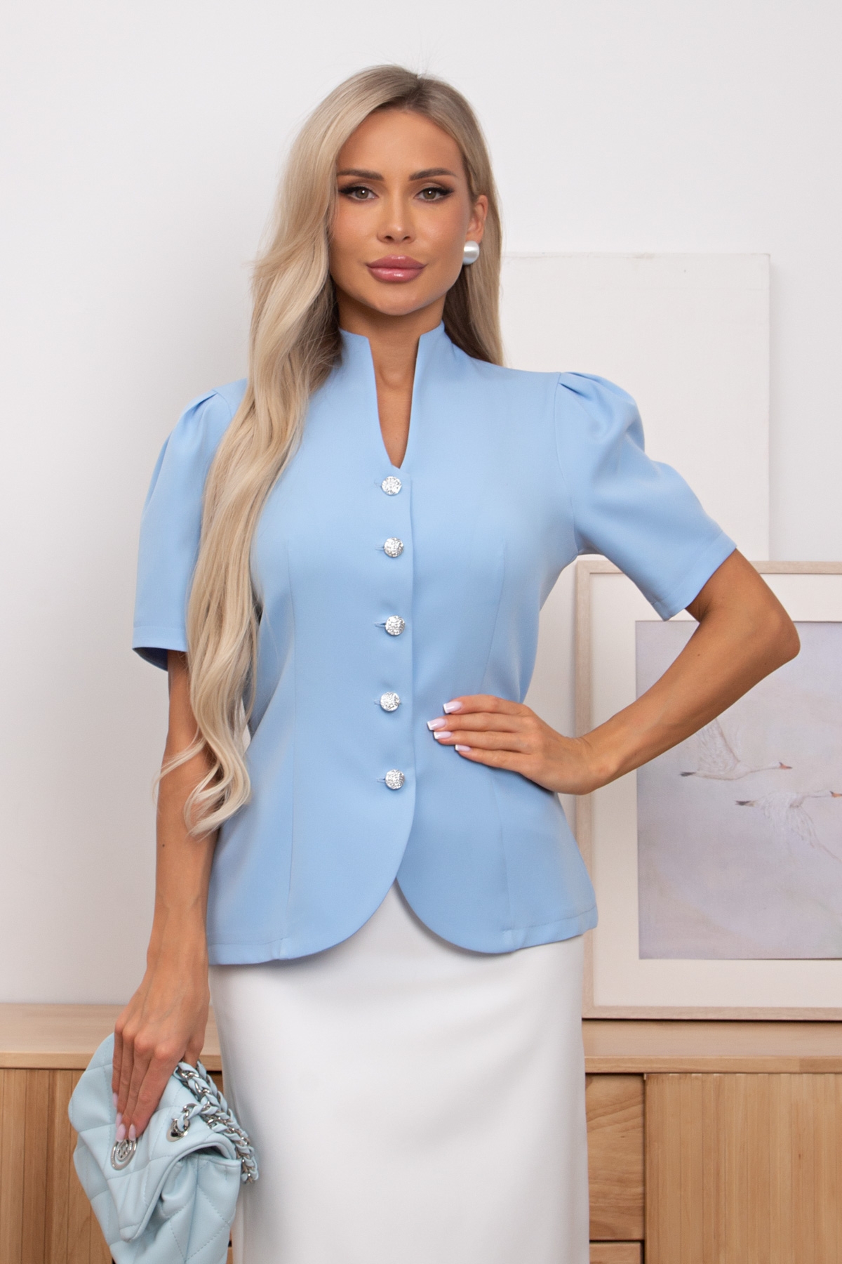 Элегантный жакет приталенного силуэта из плательно-костюмной ткани. Втачной рукав-фонарик. Горловина оформлена цельнокроеной стойкой. По переду выполнена планка с застежкой на петли и пуговицы. Модель без подкладки.