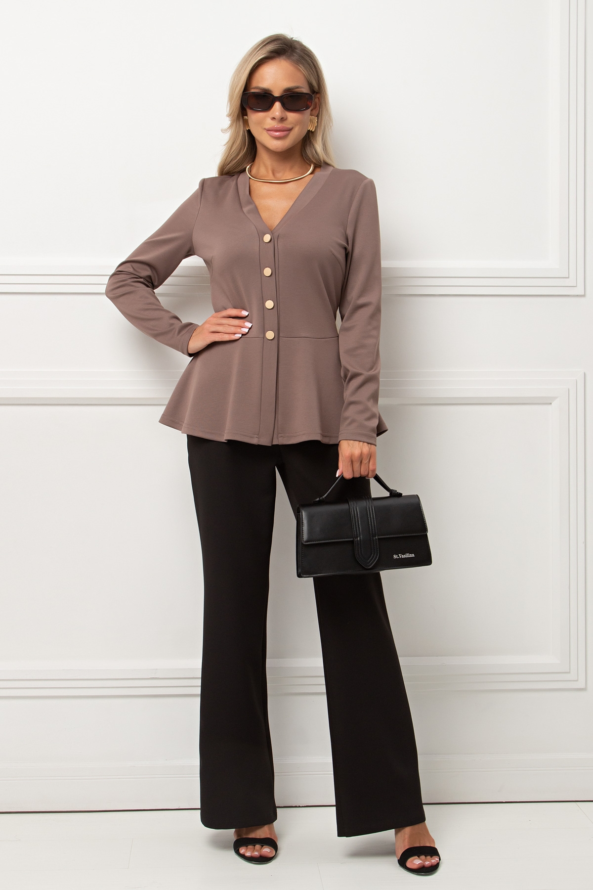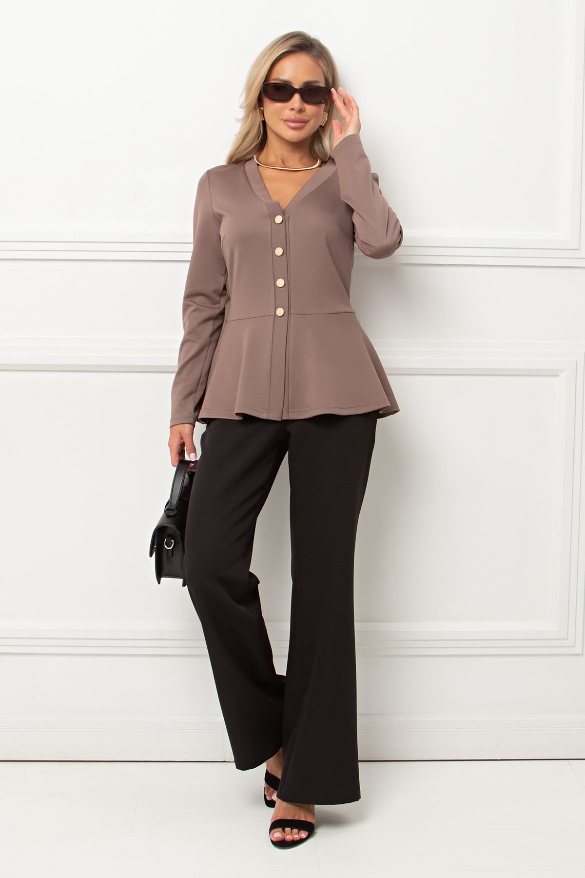 Элегантный приталенный жакет с баской из трикотажного полотна. Длинный втачной рукав. V - образная горловина переходящая в планку с застежкой на петли и пуговицы. Низ ровный ,без разрезов.