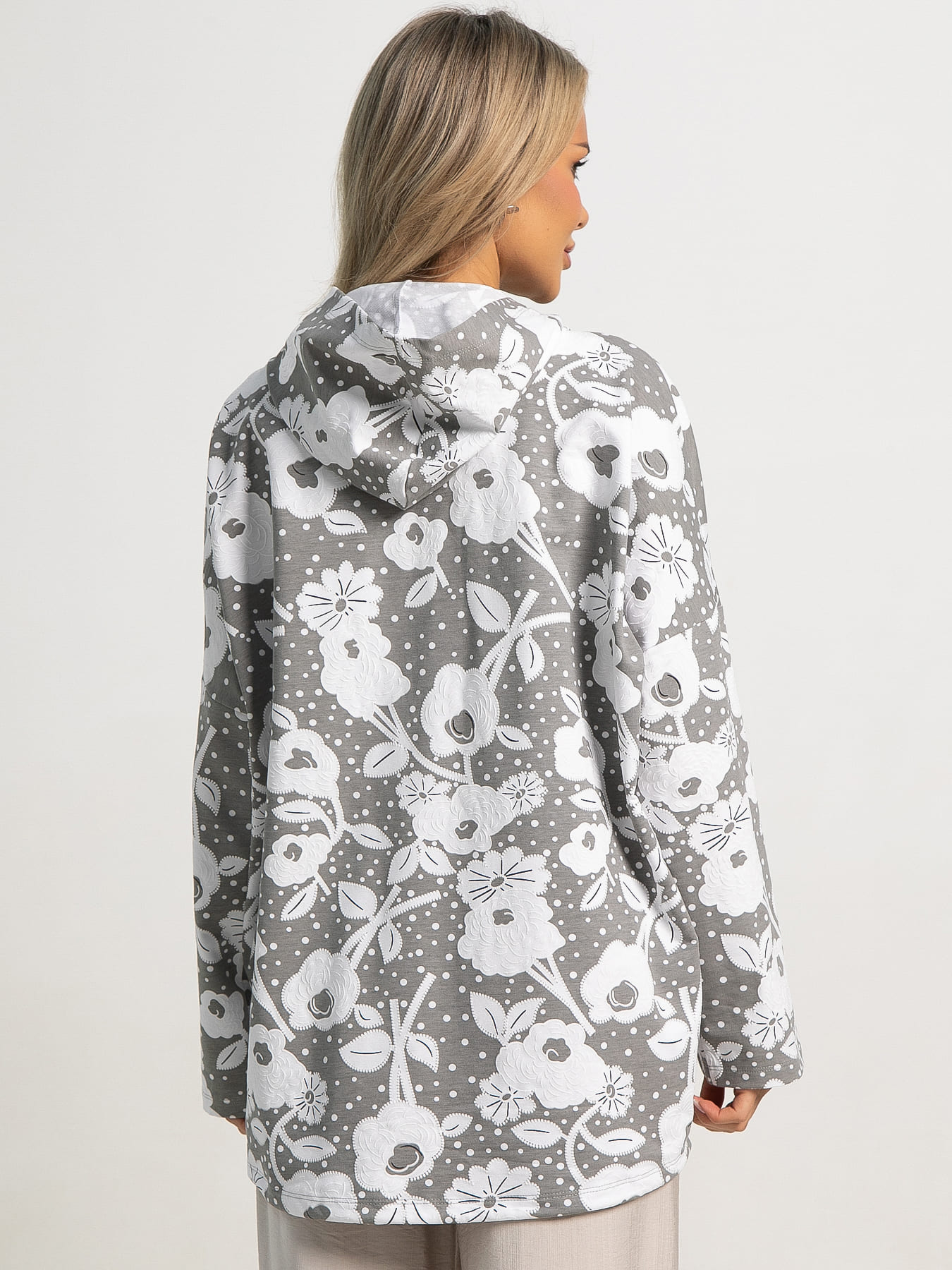 Женский жакет с капюшоном — это яркий и удобный выбор для повседневной носки. Свободный крой подходит для любой фигуры, обеспечивая комфорт и свободу движений. Цветочный принт придаёт образу свежесть и женственность. Спущенное плечо и длинные рукава создают расслабленный и модный силуэт. Удобная молния по всей длине облегчает надевание и снятие. На передней части есть два накладных кармана для мелочей, а внизу — затяжка со шнурком для регулировки посадки. Этот стильный жакет добавит свежести и женственности вашему гардеробу!
