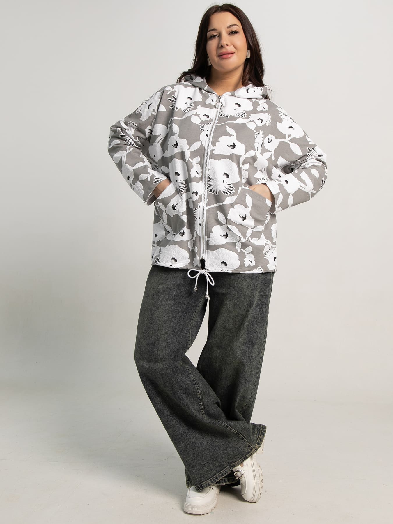 Женский жакет с капюшоном — это яркий и удобный выбор для повседневной носки. Свободный крой подходит для любой фигуры, обеспечивая комфорт и свободу движений. Цветочный принт придаёт образу свежесть и женственность. Спущенное плечо и длинные рукава создают расслабленный и модный силуэт. Удобная молния по всей длине облегчает надевание и снятие. На передней части есть два накладных кармана для мелочей, а внизу — затяжка со шнурком для регулировки посадки. Этот стильный жакет добавит свежести и женственности вашему гардеробу!