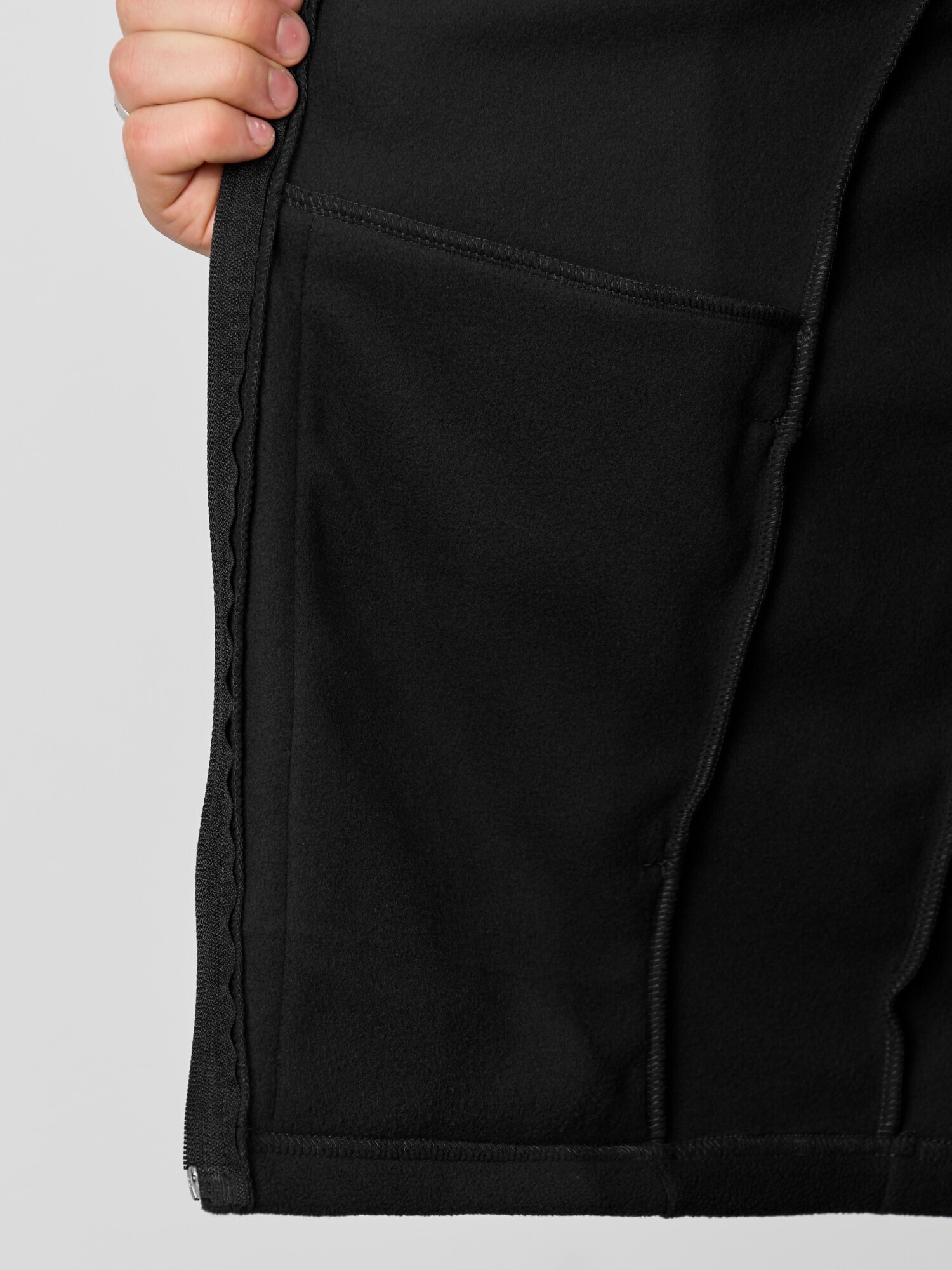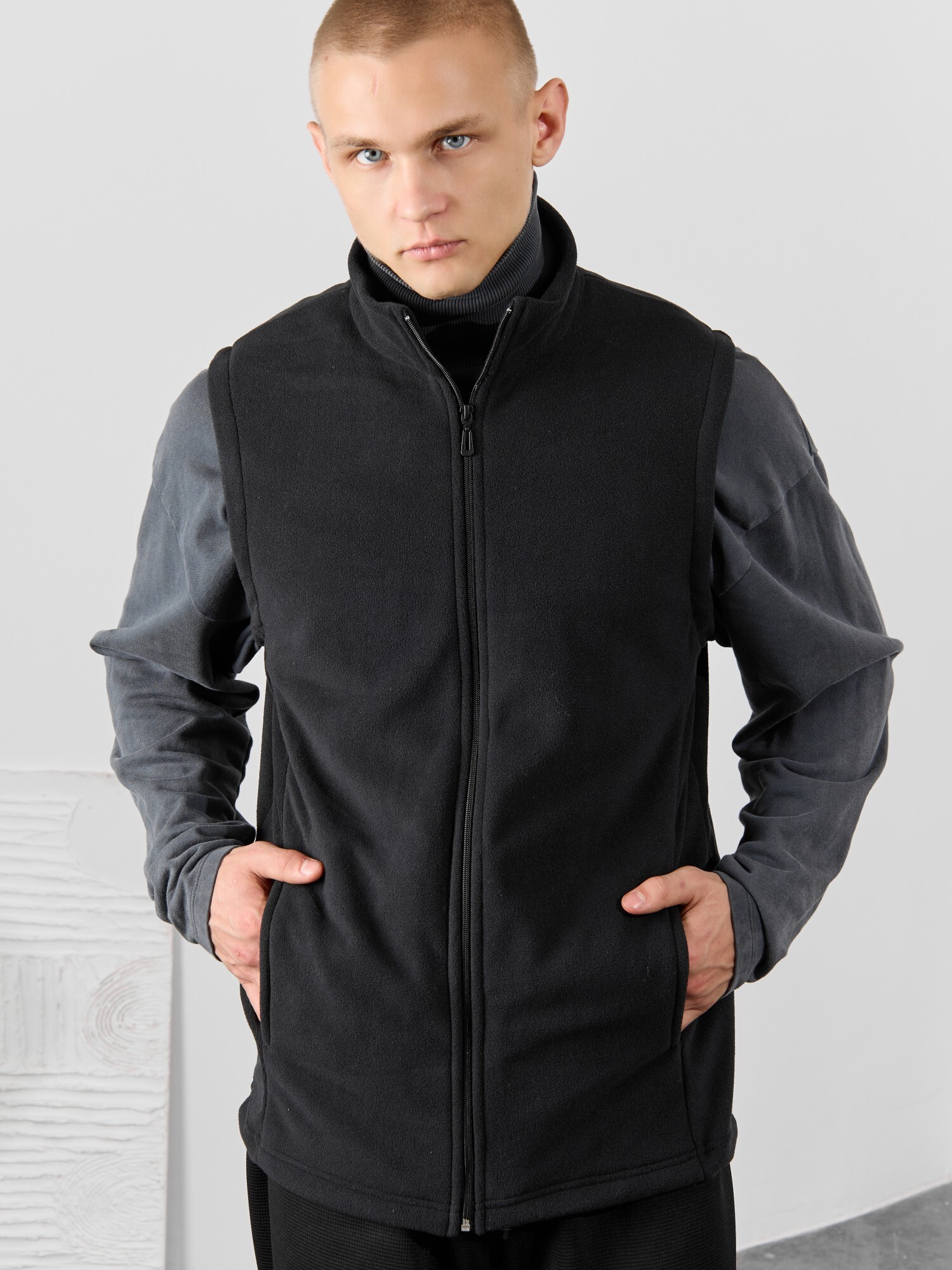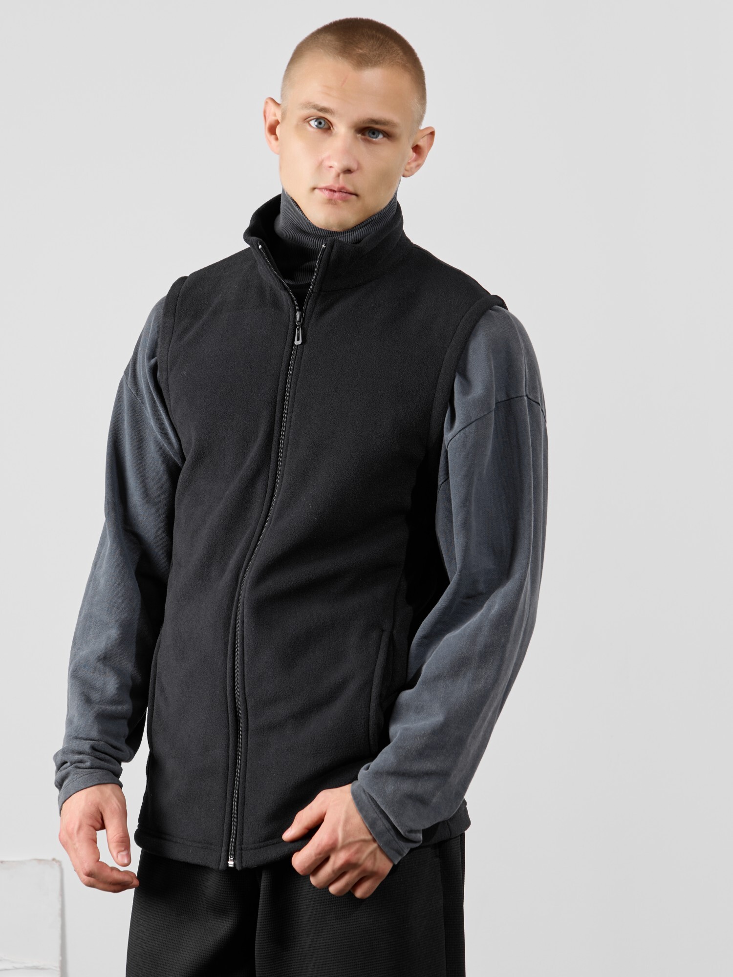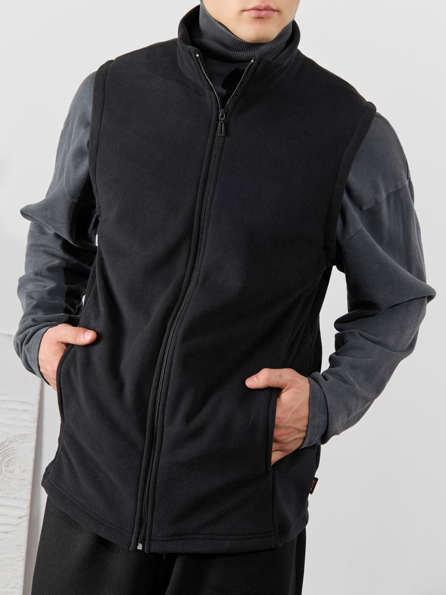 Жилет мужской из флиса, прилегающего силуэта, с воротником-стойкой , центральной боротовой застежкой на тесьму "молния" и вертикальными рельефами на полочках, в швах которых обработаны карманы. Проймы и низ изделия обработаны подгибкой. В нижней части левого бокового шва вставлен небольшой декоративный элемент из репсовой ленты.
