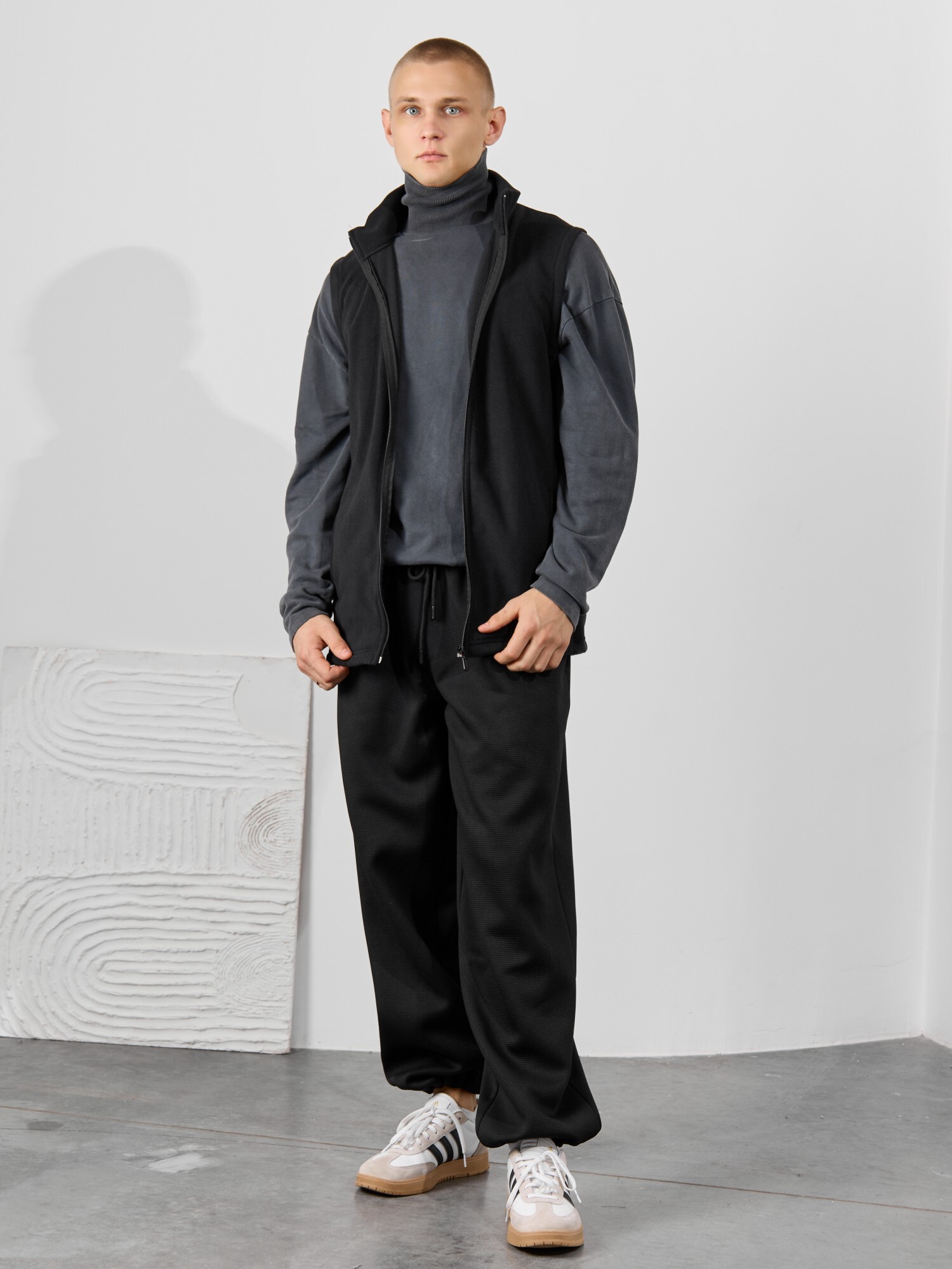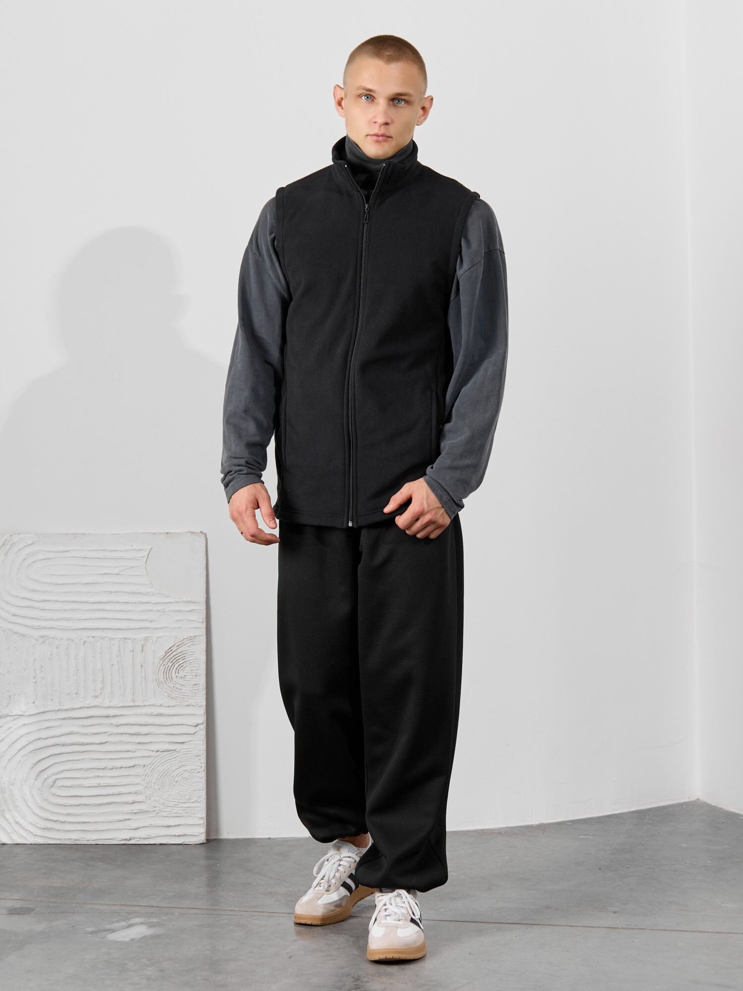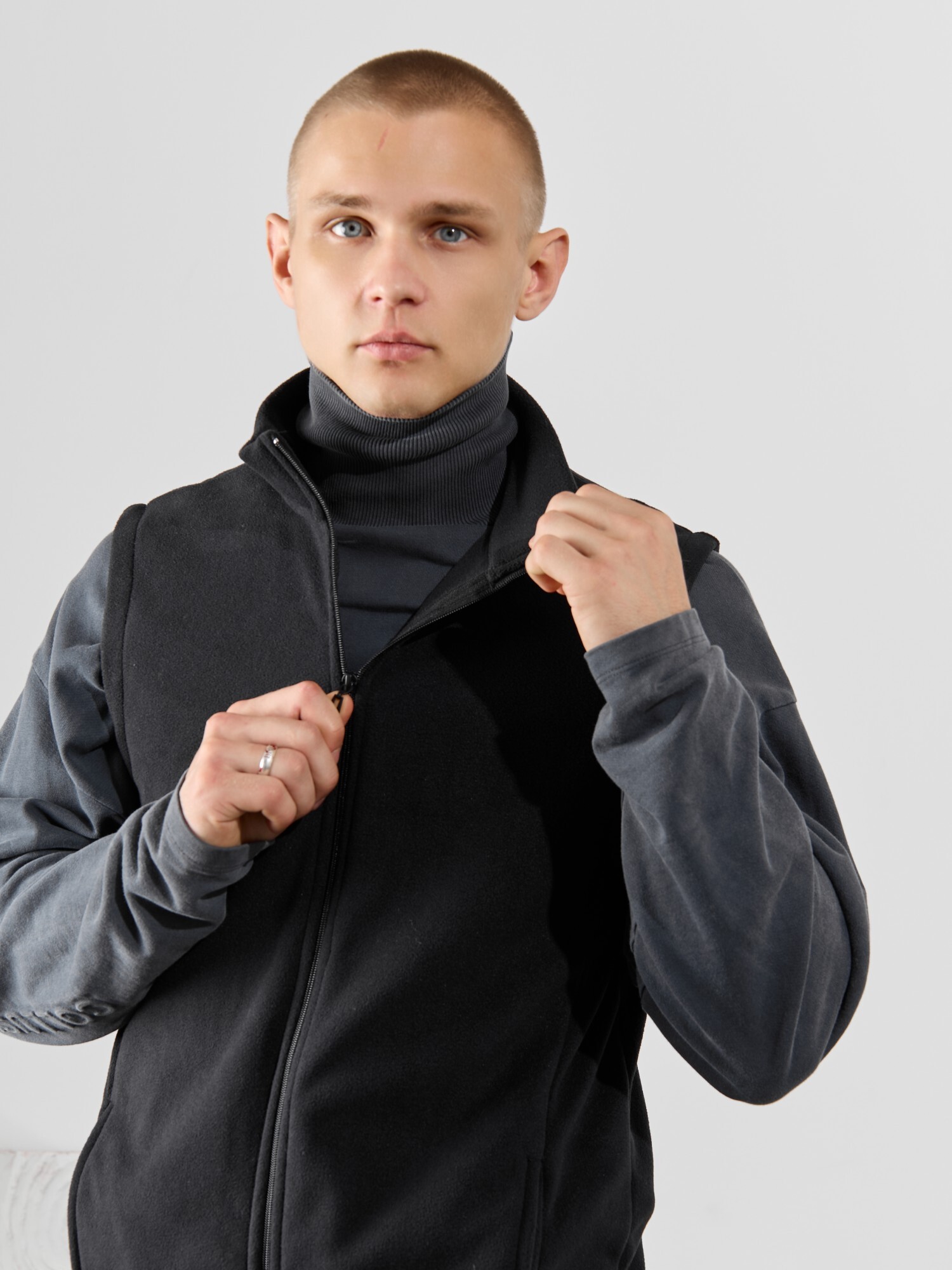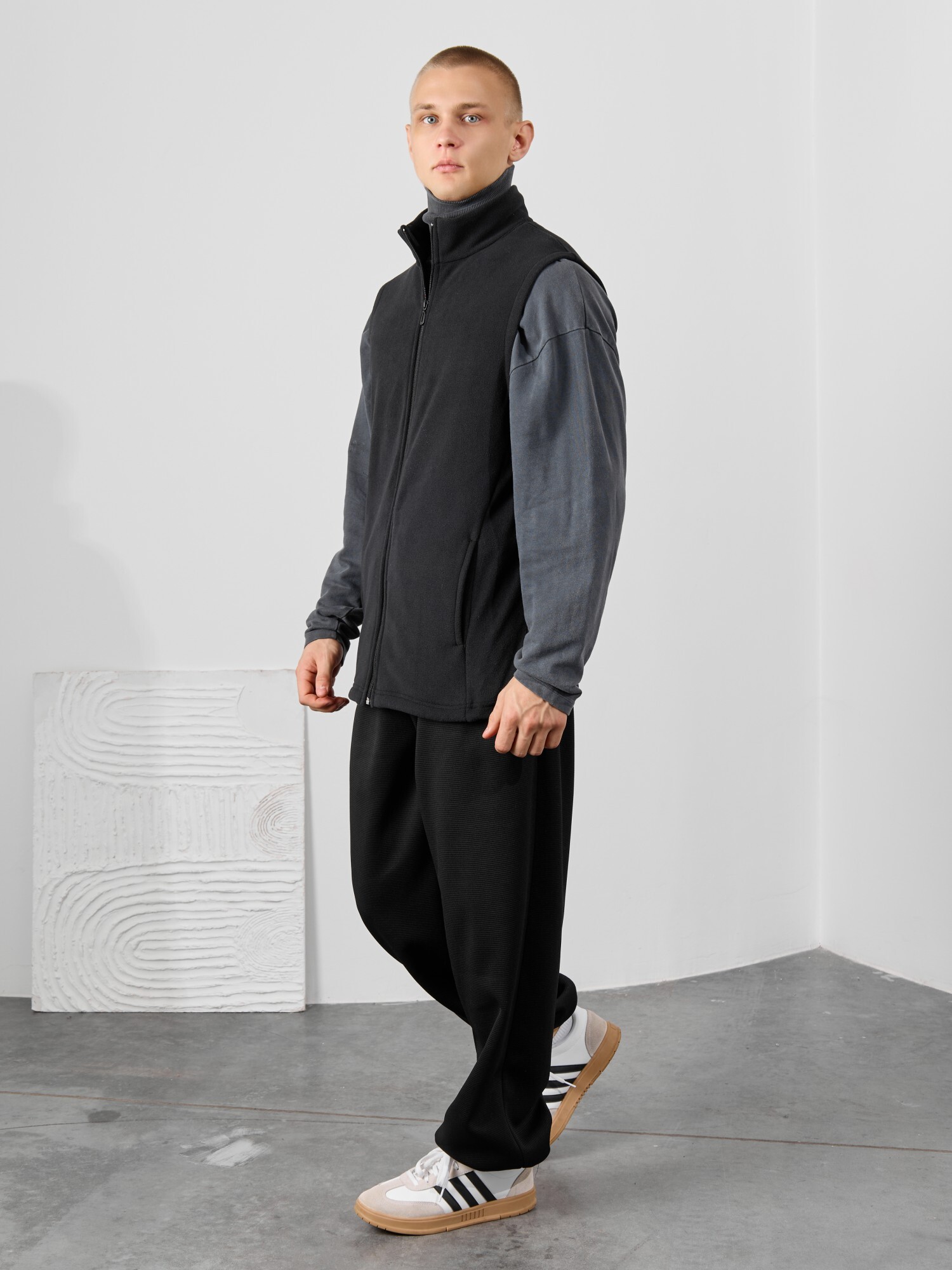 Жилет мужской из флиса, прилегающего силуэта, с воротником-стойкой , центральной боротовой застежкой на тесьму "молния" и вертикальными рельефами на полочках, в швах которых обработаны карманы. Проймы и низ изделия обработаны подгибкой. В нижней части левого бокового шва вставлен небольшой декоративный элемент из репсовой ленты.