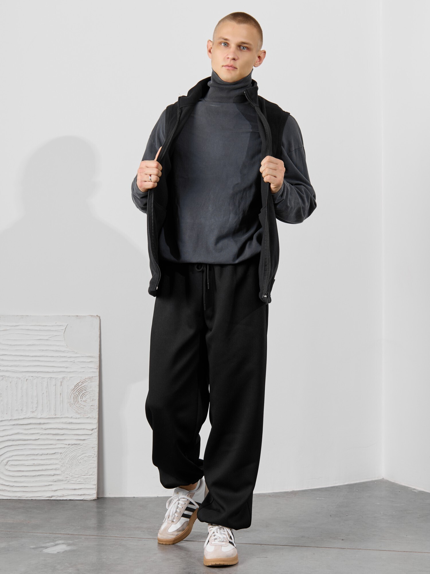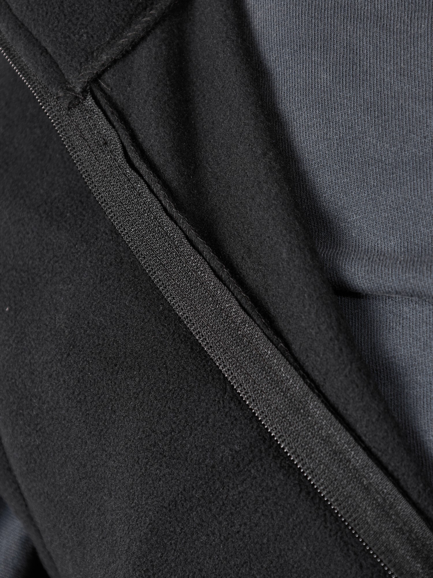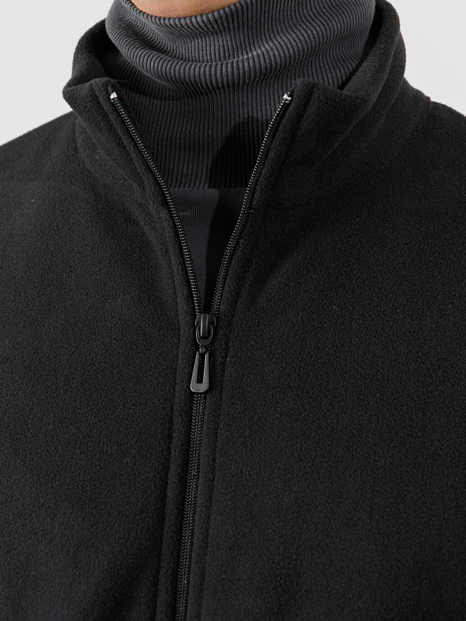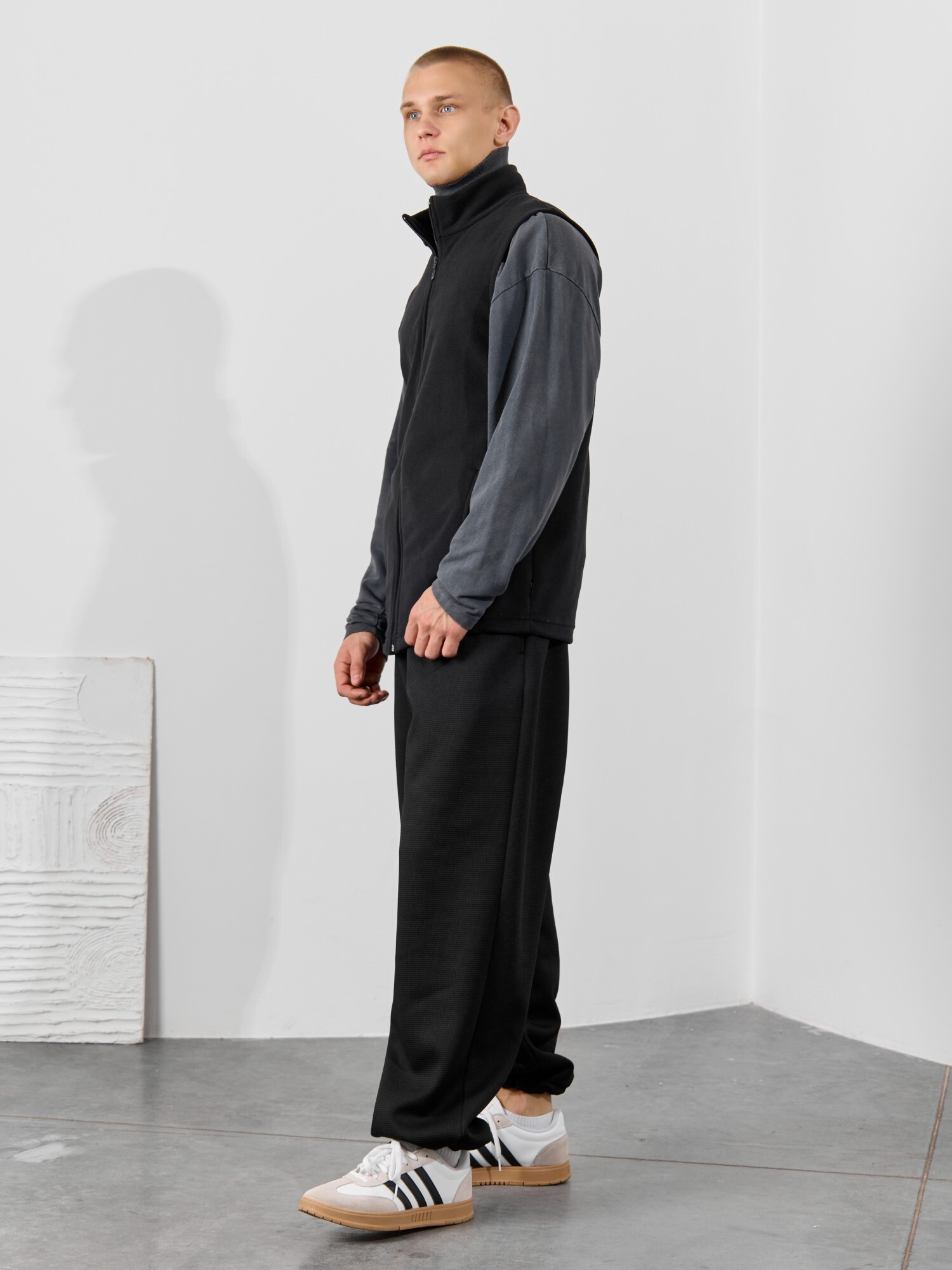 Жилет мужской из флиса, прилегающего силуэта, с воротником-стойкой , центральной боротовой застежкой на тесьму "молния" и вертикальными рельефами на полочках, в швах которых обработаны карманы. Проймы и низ изделия обработаны подгибкой. В нижней части левого бокового шва вставлен небольшой декоративный элемент из репсовой ленты.