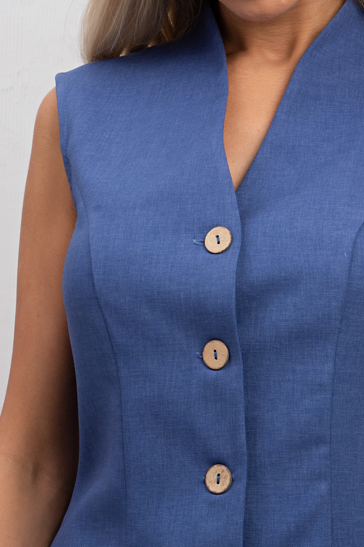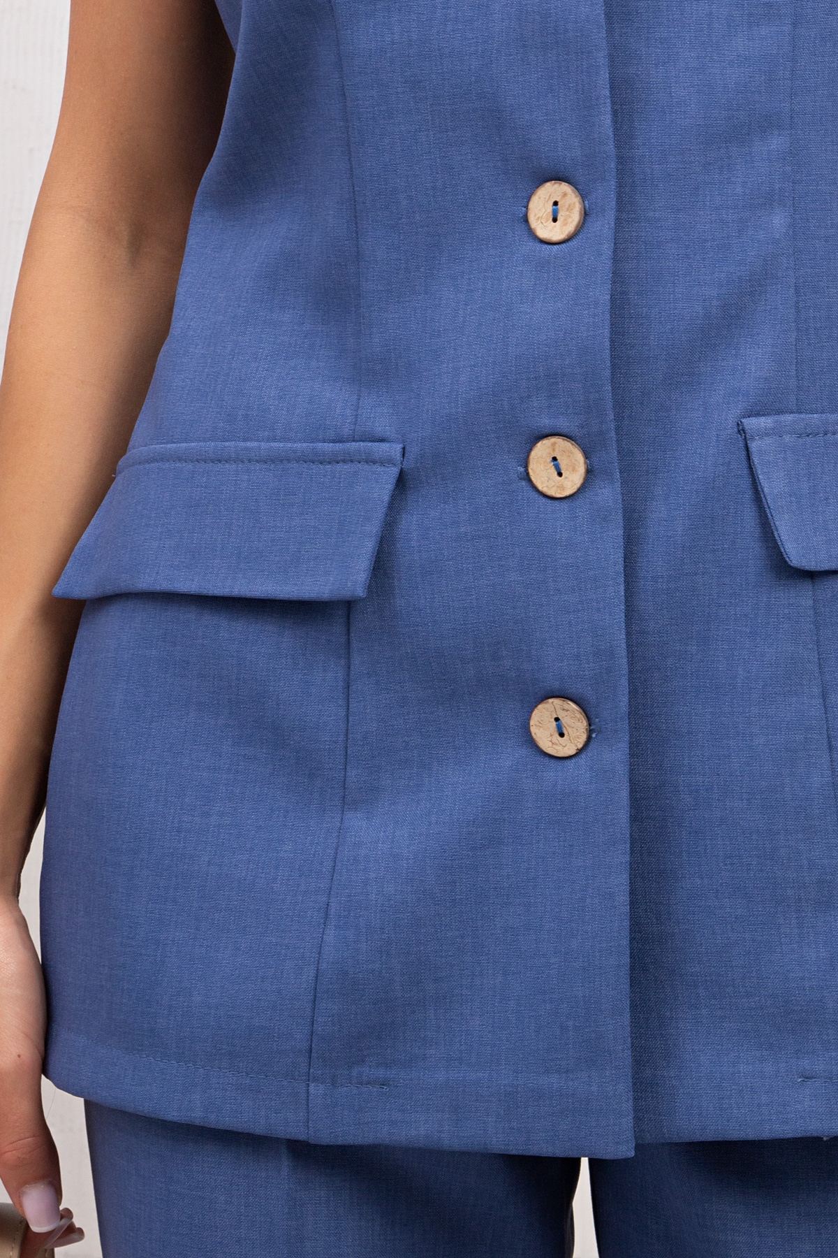 Стильный летний жилет изготовлен из текстильного полотна. Жилет прилегающего силуэта,V-образная горловина переходящая в планку с застежкой на петли пуговицы. Перед дополнен накладными клапанами .