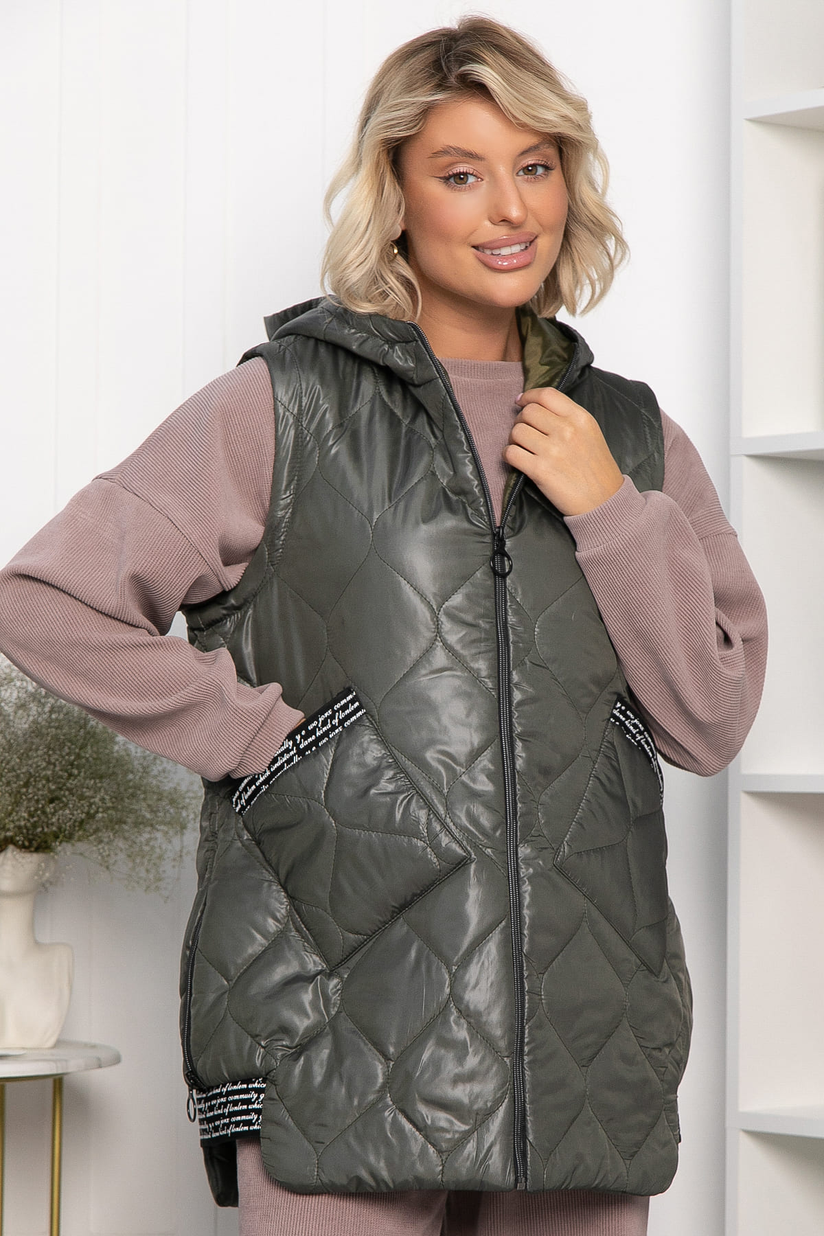 Стильный и практичный жилет в оттенке хаки станет незаменимым спутником в прохладную погоду.
