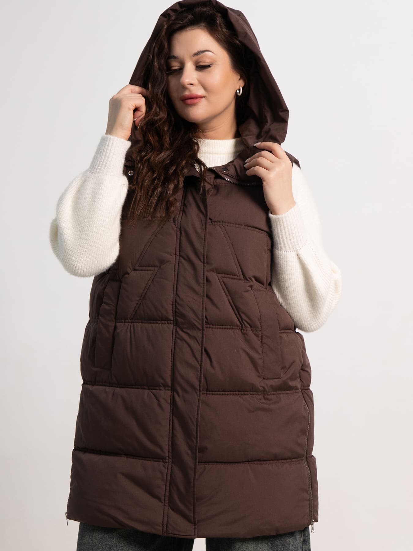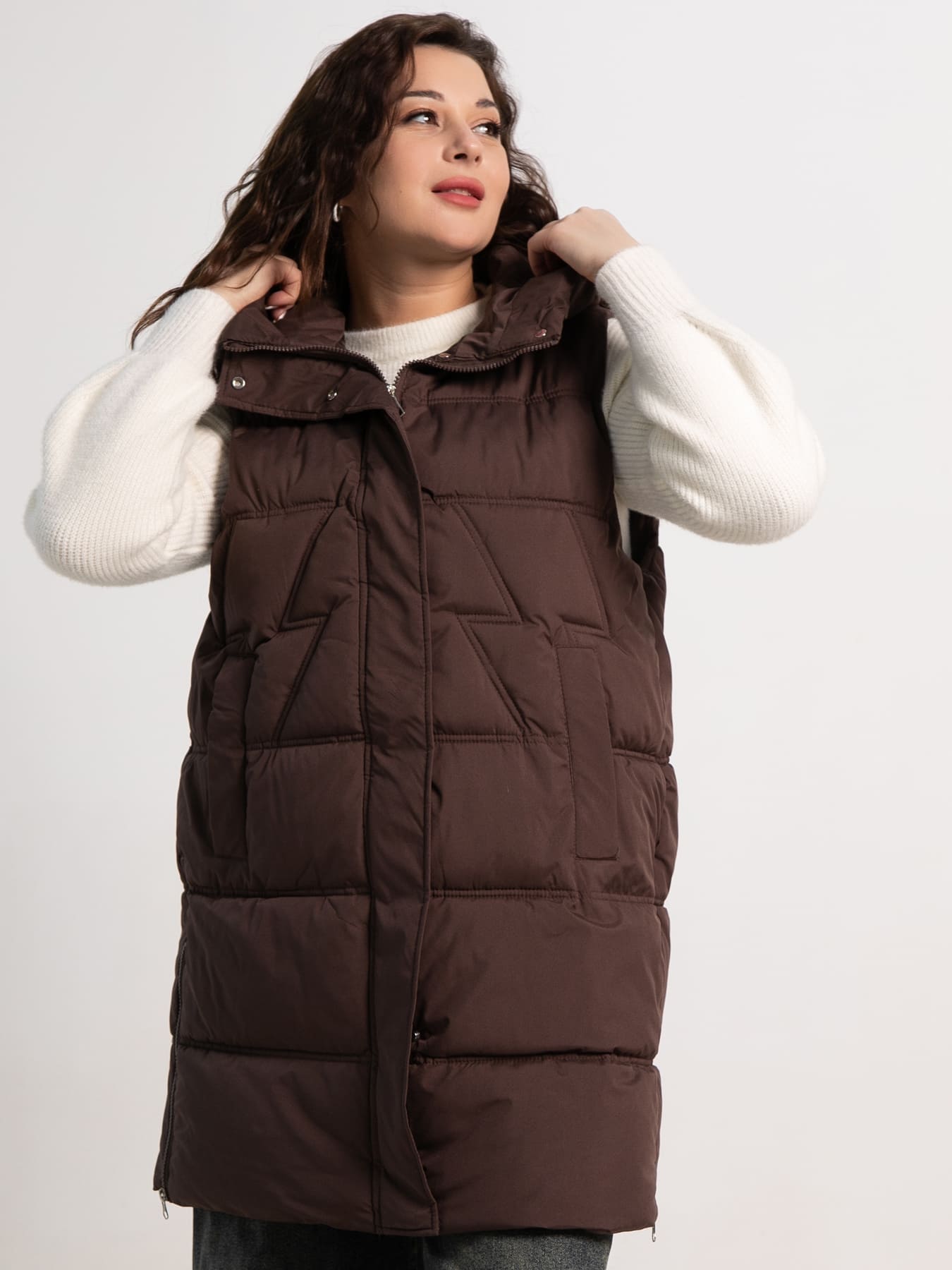 Удлиненная жилетка прямого кроя в красивом цвете горького шоколада – идеальное решение для создания современных и практичных образов в прохладную погоду. Эта модель сочетает актуальный дизайн, высокое качество материалов и продуманные детали. Удобный капюшон защищает от ветра и холода, а функциональная молния по бокам обеспечивает легкость в использовании. Подкладка делает жилетку приятной к телу и добавляет комфорт. Она станет незаменимым элементом вашего гардероба, позволяя создавать стильные и теплые образы на каждый день.